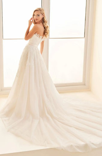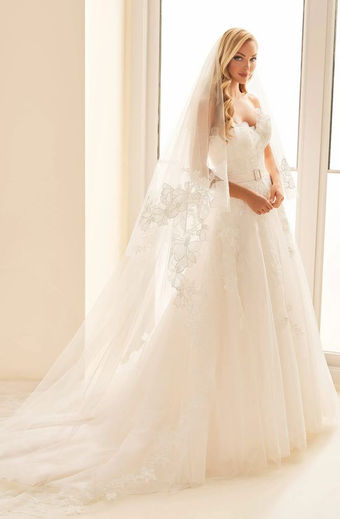 Celebrate forever in this captivating a-line gown. Featuring a flattering sweetheart neckline adorned with dreamy three-dimensional lace appliqué, this gown is perfect for the bride who wants to make an unforgettable statement. A delicate bridal belt accentuates and slims the waist, while a stunning cathedral train ensures every step is a showstopper. A matching veil completes this one-of-a-kind bridal style.