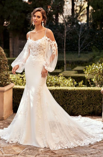 Our Allira gown is the bohemian wedding dress of your wildest dreams. The modern fit and flare silhouette paired with a traditional scoop neckline makes Allira an alluring style that will leave your guests in awe. The bodice is adorned with luxurious floral lace details that trickle onto the ethereal bishop sleeves. A unique feature of this gown is the cold shoulder, which adds the perfect amount of bohemian glamour! The flared skirt is semi-seer, making the magnificent lace details stand-out as they trickle from the bodice down throughout the skirt. The petal-shaped train is lined with floral lace for the perfect ethereal finish to this dress.